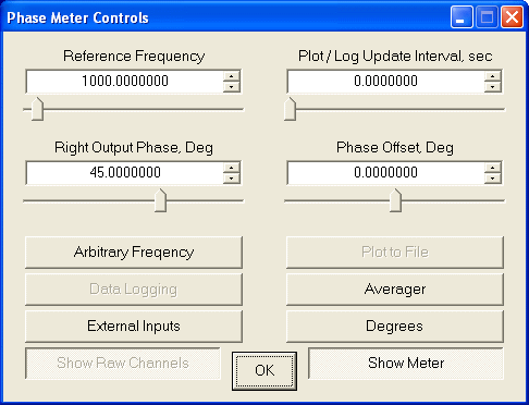 Phase Plotter Self-Test:If you want to experiment with the Phase Plotter option without having a complete test setup and a changing phase signal, you can use the loopback or Internal Test options discussed previously under Self-Test Options. In either case, you can use the Right Output Phase control to move the plot line up and down the screen. But you can also increment External Inputs through Internal Test to Internal Test + Phase Mod. This will activate phase modulation on the Right output channel to get a smoothly-changing plot. Now follow the Phase Modulation Setup instructions under Custom Reference . You can create a large variety of phase plots, with various waveshapes and behaviours. If instead you want to add noise or some other waveform to the signal (not the phase as above), follow the directions under the Averager topic. Another experiment you can try is to first select Internal Test mode without Phase Mod. The phase plot should show a constant flat line at the Right Output Phase value. Then open the Generator dialog and click Right Wave Controls. Tone Freq is the "signal" frequency, and will be set to the same Reference Frequency you set in Phase_Meter. Set it 0.10 Hz higher, and there will be an ever-increasing phase shift between them. The phase plot will show a straight-line ramp until it hits 180 degrees, then it will wrap to -180 and continue up again. The full ramp cycle takes 10 seconds (the reciprocal of the frequency difference). Setting Main Freq to 0.10 Hz lower than the Reference will reverse the ramp direction.