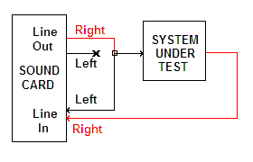Initial Set-Up:Typically, you would use Left Out from the Daqarta Generator as the reference source to drive the external system under test, and measure its response on Right Line In. In this case, you must also feed Left Out to Left Line In to serve as the reference input: Alternatively, you can use the Phase_Meter with an external sine wave reference connected to Left Line In, and the response connected to Right Line In: Usually, to make connections to the sound card, it will be easiest (and least expensive) to cut a male-male stereo cable in two and strip the internal conductors. (Left is white, Right is red, bare metal shield is ground) For initial set-up tests, you can make connections by twisting the stripped wires. The system under test may have specific connector requirements, or you may be able to connect to it with clip-leads. Don't forget to connect the shields to each other for the Left Out to Left In cable, and/or to the grounds of the external reference and system under test. Whether you use the internal or external reference, you must make sure that Line is selected in the Input control dialog. Don't use Mic, unless that is all you have and it supports stereo... most Mic inputs don't. If your card has Input Level controls, set them to 0 (maximum sensitivity) for now. Start Phase_Meter and adjust for strong but undistorted signals on the Left (yellow) and Right (red) Input waveforms. If you are using the internal reference, use the F9 function key to open the Generator volume sliders, and adjust the reference output while watching the input waveforms. With an external reference, adjust its level to eliminate any obvious distortion on peaks. Note that sound cards differ in their input capabilities, and that some cards reach overload at only about half of full scale. Ideally, you want the maximum undistorted input levels. One way to do this is raise the levels until the input waveforms are obviously clipped, then back off until the sine peaks no longer reach that level. You can also do this by toggling to Spectrum display mode and watching the input spectrum for the appearance of harmonics, then back off until those are mostly gone. A small amount of distortion will not affect the phase measurements. Typically, even an inexpensive card or built-in chipset will show only a couple of harmonic peaks, and they will be about -80 dB lower than the main peak. As you raise the level, suddenly a forest of harmonics will jump up to -70, -60, or above. Back off to just below that jump point. If your card has Input Level controls, you may be able to reduce the sensitivity (to more-negative values) and increase the Generator Master and/or Wave volume sliders while keeping low distortion. That provides a stronger driving signal to the system under test, if needed, and will give a better signal-to-noise ratio. If the system under test causes a lot of signal attenuation, you may need to reduce the Left In (reference) sensitivity more than Right In (response signal). Once you have the levels adjusted, click the Save Setup button in the Generator control dialog to save the PhaseMeter.GEN setup. The next time you run the Phase Meter it will use the saved Generator levels. If you are using the internal Generator reference, set the Reference Frequency control to the desired frequency... see that subtopic below for more details.
