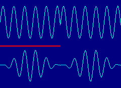 Fig. 1: Repeating a Non-Integer Period It's the spectrum of this spliced waveform, not the true input waveform, that is actually computed by the DFT or FFT. As we saw last time, it contains lots of "leakage" energy at frequencies other than the desired one. How can we reduce that leakage? One idea is to adjust the length of the data set to exactly match the input period. This can be done by adjusting the number of samples used by a DFT, but the DFT is notoriously inefficient. The FFT is much more efficient, but its requirement for power-of-2 sample sets obviously precludes fine adjustments. Alternatively, in a real-time system it might be possible to adjust the sample rate, and hence the duration of a fixed-size sample set, to get a perfect match. But either of these "adjustment" methods would be cumbersome at best, and neither would be feasible for signals containing multiple uncorrelated waves. Look again at that problem signal in Figure 1. Suppose we taper it smoothly to zero at both ends of the data set, so that it splices cleanly no matter what the actual frequency or waveform. If we provide the taper by multiplying the input by an envelope or "window" having a sinusoidal shape (actually a raised inverted cosine in this case), we get a waveform that is normally associated with 100% amplitude modulation. The raw and windowed waveforms are shown in Figure 2: