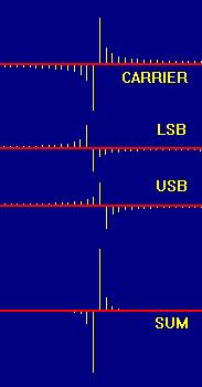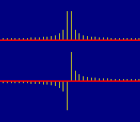 Fig. 3: Magnitude and Signed Leakage Spectra Note that all the components above the input frequency show positive amplitudes, while those below it are negative. That's because these leakage components result from multiplying the input by the various spectral line reference frequencies, and each product includes a difference-frequency term. For reference frequencies above the input frequency, that difference is positive. For those below, it is negative. Recall that a negative-frequency sine moves backward in time, going through the same values as a positive-frequency sine that has a negative amplitude. (The above-mentioned products also include sum-frequency terms, but as discussed last time they contribute much less to each leakage component and don't affect its sign.) The windowed spectrum is the sum of this input spectrum, plus similar spectra for the two half-amplitude sidebands shifted one line higher and lower. Note that from the modulation formula these sidebands are inverted in sign relative to the input carrier. The situation is shown in Figure 4, with the input on top, then the lower and upper sidebands, and the signed sum of all these on the bottom trace.
