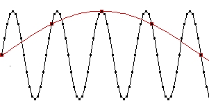 Fig. 1: Aliasing Note that although the black curve could have simply been drawn "by eye" in a connect-the-dots fashion, in general it requires consideration of the sinusoidal nature of the signal. When there are few samples per cycle, a straight-line approximation would give a poor representation of the waveform. Nevertheless, an FFT analysis could provide the frequency, amplitude, and phase parameters needed to reproduce the input exactly. However, if the sample rate is reduced by a factor of 18, to 2666.7 Hz, then the new samples (red in Figure 1) coincide with every 18th sample of the original data. Now there is less than one sample per cycle of the input wave. Without knowing the actual frequency of the input, the best-guess fit to this new data would be the curve shown in red. Since this apparent or alias wave takes 4 samples to go through a half cycle, or 8 for a full cycle, we would assume that the input frequency is 2666.7/8=333.3 Hz. The frequency measurement would thus be in error by a factor of nine! And even an FFT would give this same erroneous result... the bite of the alias vampire. Such alias signals arise whenever the input signal is more than the Nyquist frequency, which is half the sample rate. This is sometimes known as the "folding frequency", because the effect is as though you had folded the true spectrum about that point, causing high frequency components to appear down at the low end of the spectrum. This is actually a pretty good analogy, since it allows you to figure out where those aliased components will appear. For example, if the Nyquist frequency is 10 kHz (sample rate of 20 kHz), then input components under 10 kHz will appear at their proper locations. But an 11 kHz input will be folded about the 10 kHz point, so it will appear as an alias at 9 kHz. If you sweep the input frequency, a real-time spectrum will show a single peak that moves up until it "hits" the Nyquist frequency and "bounces off". As you continue to increase the input frequency, this peak will now move down toward the low end. The peak will hit zero frequency (DC) when the input is just at the sample frequency, and if you keep sweeping it will bounce back and continue upward. Given a known input and sample rate, you can figure out where the alias will appear on the spectrum. Divide the input frequency by the Nyquist, and look at the integer portion of the quotient. If it is 0, the input will be shown properly, with no alias. If the integer is odd, you'll get an alias that is coming down from the Nyquist by the fractional part of the quotient (in other words, at the Nyquist frequency times one minus that fraction.) If the integer is even, the alias will be coming up from zero by that fraction of the Nyquist. In the previous example, 11 kHz/10 kHz=1.10, since the integer is odd we know the alias will be coming down from the Nyquist. Its exact location will thus be (1 - 0.10) × 10 kHz=9 kHz. An input at 23 kHz would give 23 / 10 = 2.30, and since it is even the alias would appear at 0.30 of the Nyquist or 3 kHz. Note that you can't work this rule backward to find an unknown input frequency given an observed peak: You can't even tell a priori that a peak is an alias, let alone how many times it has been folded over or whether it's on an odd or even fold. That's part of the danger of aliases. When the input is exactly at the Nyquist frequency, or any multiple of it, the input level is indeterminate. Consider that at half the sample rate there will only be two samples per cycle, and (except for certain synchronous sampling systems) the phase will be unknown. So those two samples could come at the positive and negative peaks, or two zero crossings, or anywhere in between... you just don't know. (That's why spectrum analyzers don't usually show a line corresponding to the Nyquist frequency; it wouldn't have much meaning in most cases.) The standard defense for warding off aliases is to sample at a higher rate, and if that's not feasible then filter out all signals that could possibly cause aliases, so they are never digitized in the first place. Both of these approaches may have associated costs: Faster ADCs typically cost more, and of course at the higher sample rate you'll acquire more data which will consume more disk or memory space and take longer to analyze. A conventional anti-alias filter can be even more expensive, depending upon your demands. For example, suppose you want to build the filter in-house using standard active filter designs. The first thing you must determine is the maximum frequency of the valid signals you are trying to analyze, versus the minimum frequency you want to reject. Your filter will need to exhibit unity gain for the valid input, while attenuating the possible aliasing frequency by some specified amount. Let's say you decide you can tolerate alias components that yield amplitudes no larger than -60 dB relative to the full-scale range of the ADC. Furthermore, in this particular system the highest signal frequency will be 8 kHz, and the lowest possible alias source will be 20 kHz. You plan to set the sample rate to 20 kHz to get a Nyquist at 10 kHz, and use a plain old Butterworth filter to do the alias rejection. But after whipping out your trusty filter design charts, you discover to your dismay that it will take a filter with ten poles just to meet these minimal specs. Not only will a 10-pole filter require a lot of precision components to achieve the desired response shape, but a 10-pole Butterworth will also have a hefty overshoot in its step response as well. If you can tolerate a 1 dB ripple in the passband, you could use a 9-pole Chebyshev instead, which barely reduces the precision component count and doesn't help the overshoot at all. Conversely, if you want to reduce the overshoot while using a Bessel design, you'll need even more filter poles... a lot more if you want to eliminate overshoot completely. In fact, you may find that your old design chart